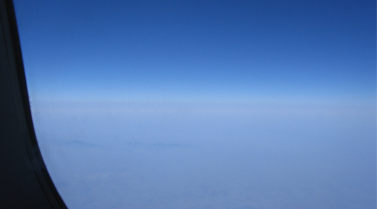 正在担心整个飞行怕是要在云层中度过,想拍几张美景的计划也可能落空,突然感觉窗外一亮,飞机终于冲出了云层。看着湛蓝清澈的天空,极远处天空、云层、地面连成一线,微微泛着白光,除了心旷神怡,我想不出其它的词来形容此时的感觉。