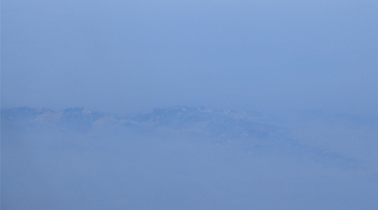 飞机又钻入了云层。当飞机再次从云层中穿出时,向下望去,地面已是一片棕褐色,零星点缀着些湖泊;远处似乎有山脉,不知是什么山系的,中学学的地理全都忘光了,估计应该快到山东了。飞得近了,那山也似乎伸手可及。想拍照留念,可是相机差劲,拍出来到效果差强人意。