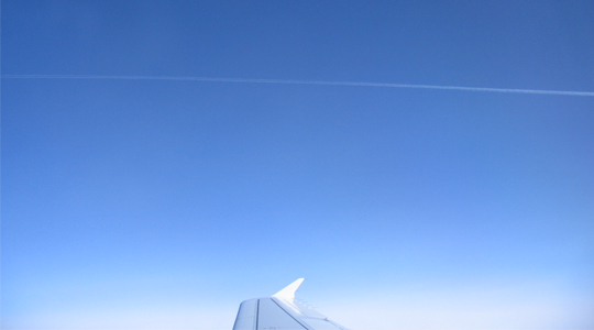 越过山脉,飞机继续平稳地飞行。忽然听见后舱一男孩叫道:“看,另外一架飞机!”我向窗外望去,只见一架客机正从我们前右侧上方飞来便要转向和我们交会而去。赶忙去摁相机的电源键,手忙脚乱之中相机开启了又被关上了,待再次启动相机,那架客机已经在空中划出一条优美到曲线,飞离了我到视线,只留下两道一时不能散尽的白烟。不禁拍腿直呼可惜。